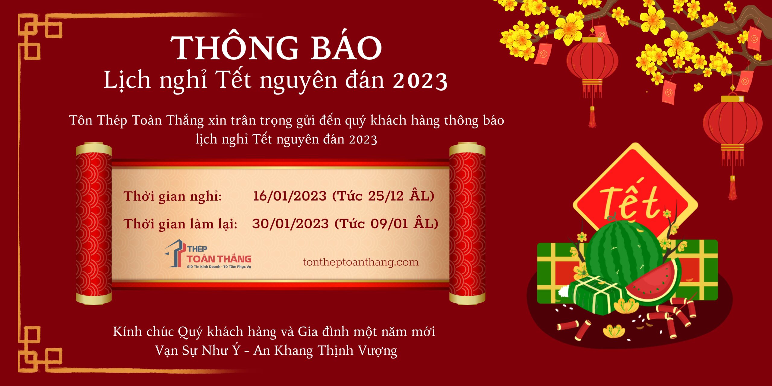 Chúng tôi xin thông báo lịch nghỉ Tết Nguyên đán 2023 để tiện cho công việc của khách hàng và đối tác. Lịch nghỉ tết nguyên đán cụ thể như sau: